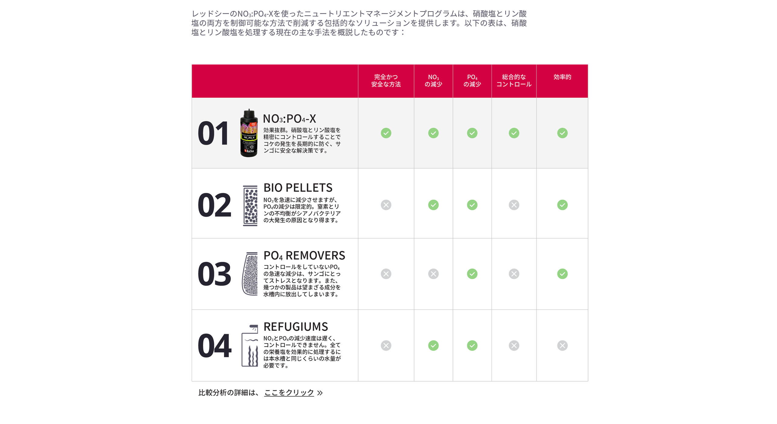 コケの栄養素をコントロールせずに減少させた場合、サンゴに共生する褐虫藻を破滅させ、サンゴのUVショックと餓死の原因となり得ます。ベストな結果を得るために、精度が0.125ppmのレッドシーの硝酸塩プロテストキットのように精密に測れるテストキットをご使用ください。